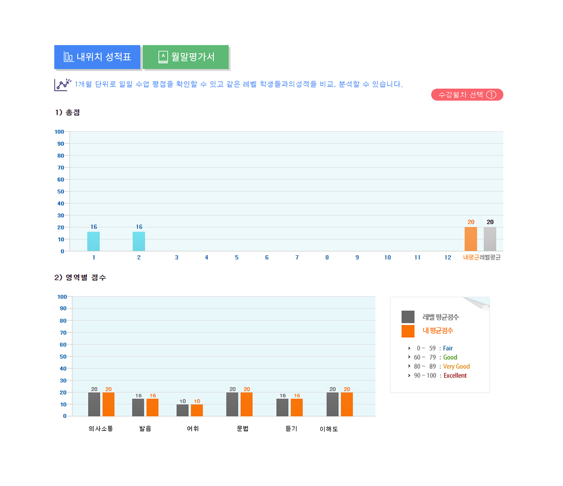 일일수업 평점과 평균값을 기준으로 같은 레벨 학생들과의 수업성취도를 비교, 평가 할 수 있습니다.