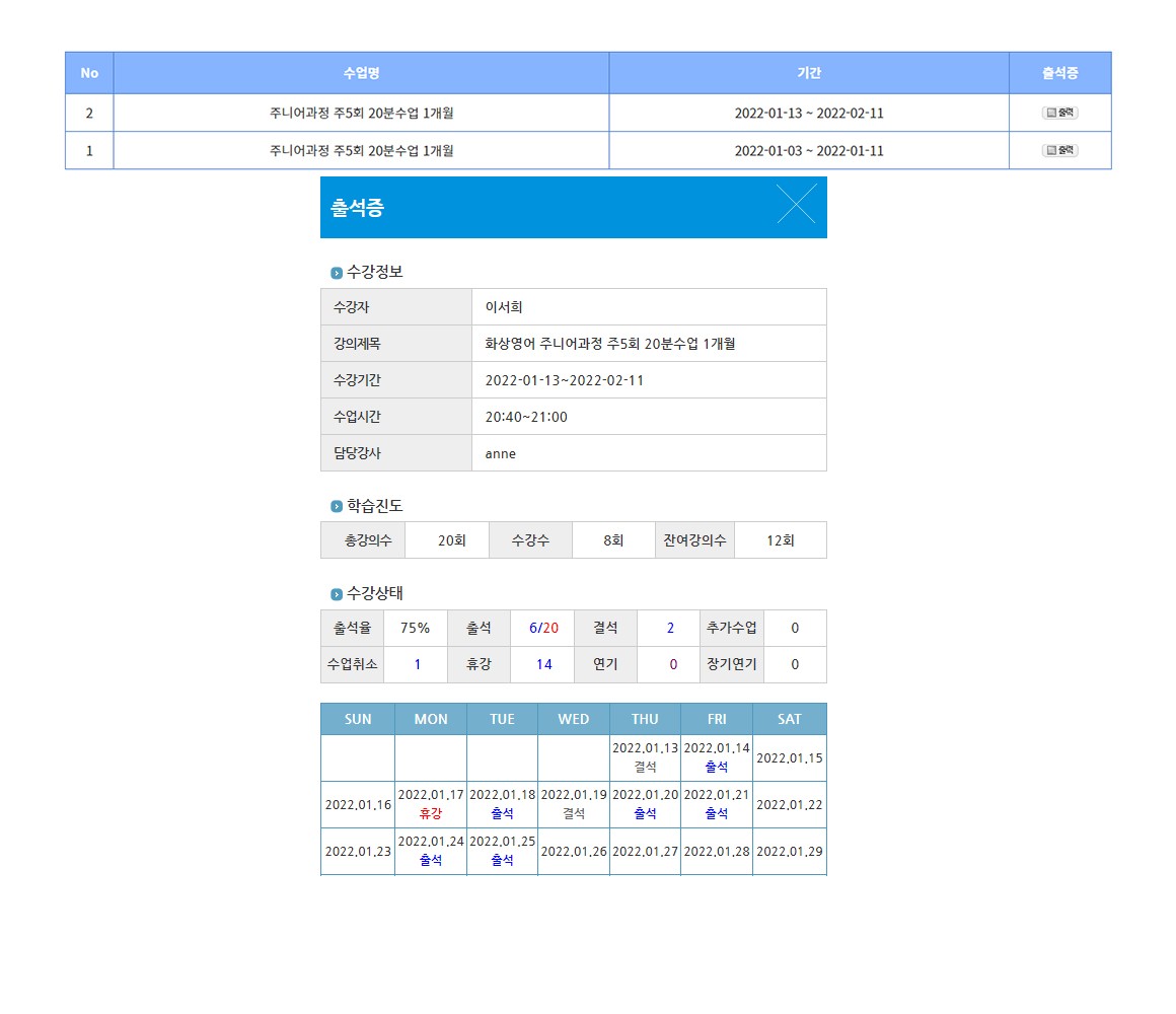 고객님의 출석정보 등을 쉽게 확인할 수 있도록 마련된 서비스이며 언제든지 조회 가능합니다.